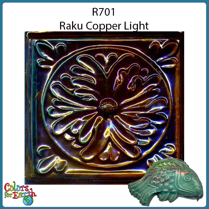 5. R702—Raku T and R707—Raku A can be applied with 1-3 coats and get different effects on the area. They are a Matt Copper/Turquoise Swirl.  When fired really hot they tend to take on more copper and less of the turquoise or aqua colors.  These can be pulled at a cooler temperature and have nice aqua/turquoise coloring.