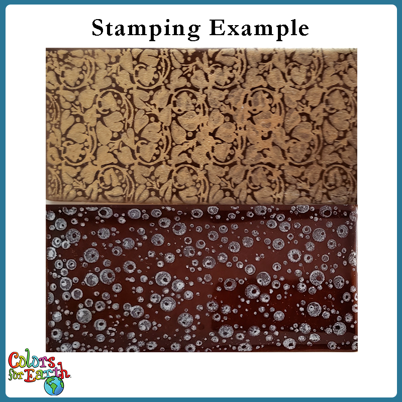 - Immediately take a CFE Sparkle or Enamel Color on the tip of a palette knife and tap on it over your wet stamped image and allow some of the powder to fall down on it in random areas.